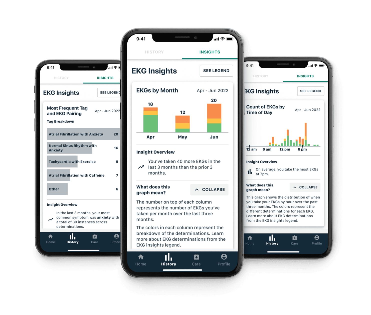 View trends in your EKG, blood pressure, and symptoms with the Insights feature to help you learn when you’re more likely to experience an arrhythmia, or if symptoms like anxiety or fatigue may be your common triggers for a heart event.